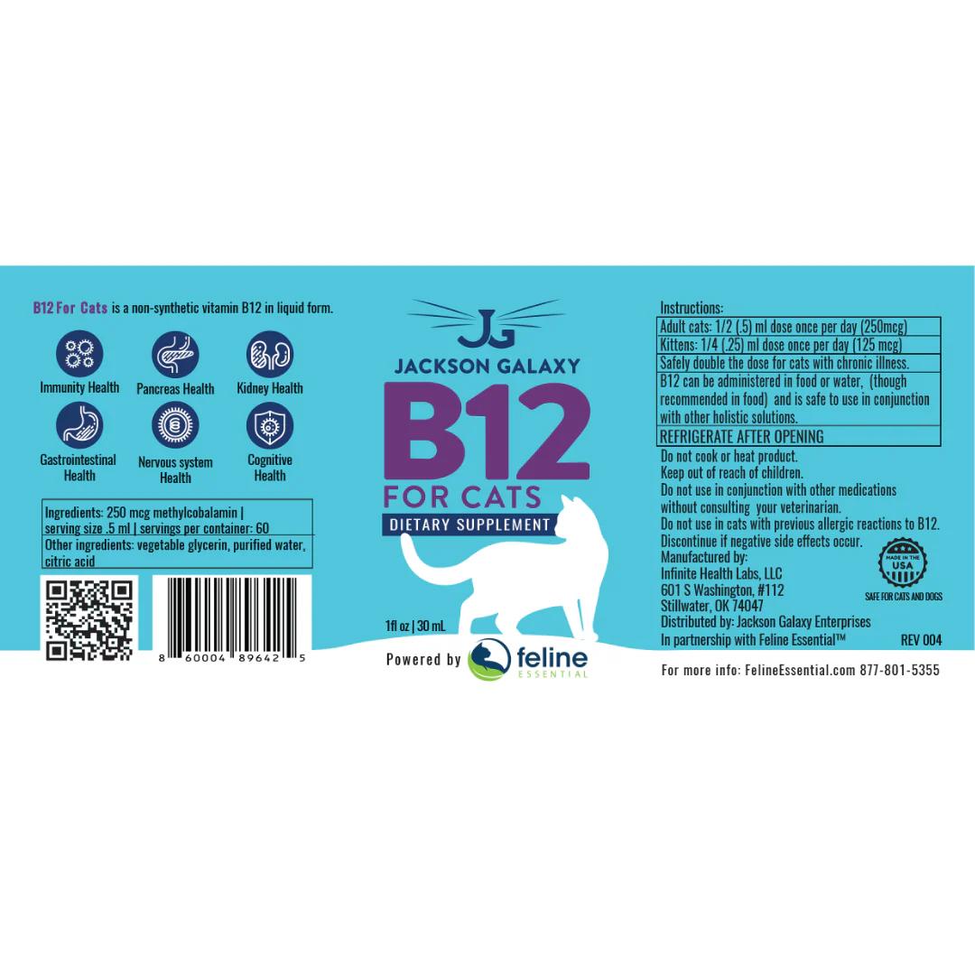 B12 For Cats (1 fl. oz.) is THE product you didn't know your cat needed! It's a natural, bioavailable, non-synthetic vitamin B12 in liquid form that supports the health of your cat’s immune system, nervous system, digestive system & cognitive function. This B12 supplement is superbly more effective to cats than its synthetic counterpart, cyanocobalamin, because it is absorbed more readily by the body. It's wonderful for senior cats who just don't absorb B12 as they used to in their younger years. Get your cat on the road to excellent health by adding B12 For Cats into their daily diet! Made in the USA.